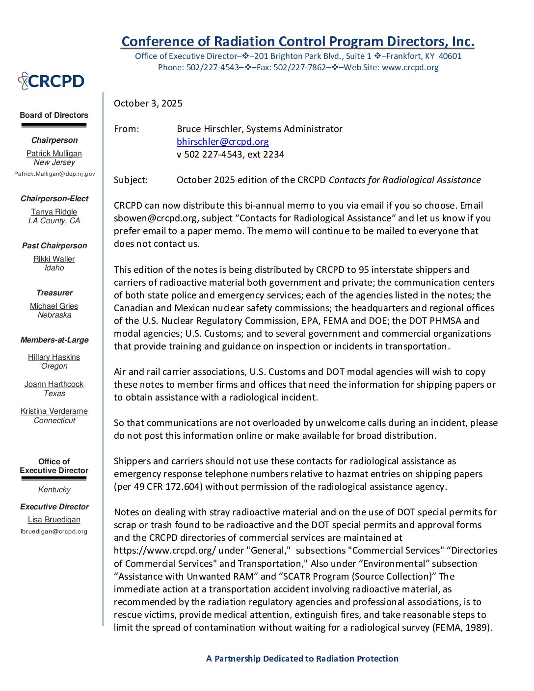 | | Contacts for Radiological Assistance – March 2025 | | | |