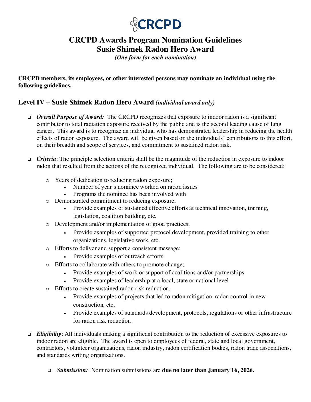 | | Susie Shimek Radon Hero Award Guidelines | | | |