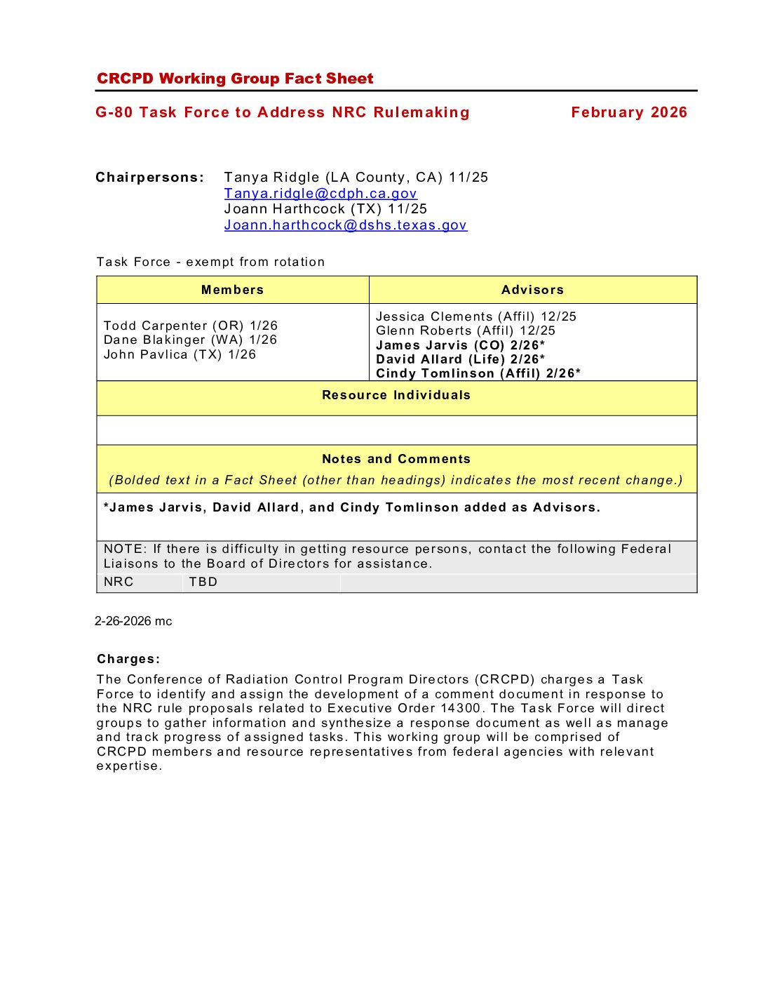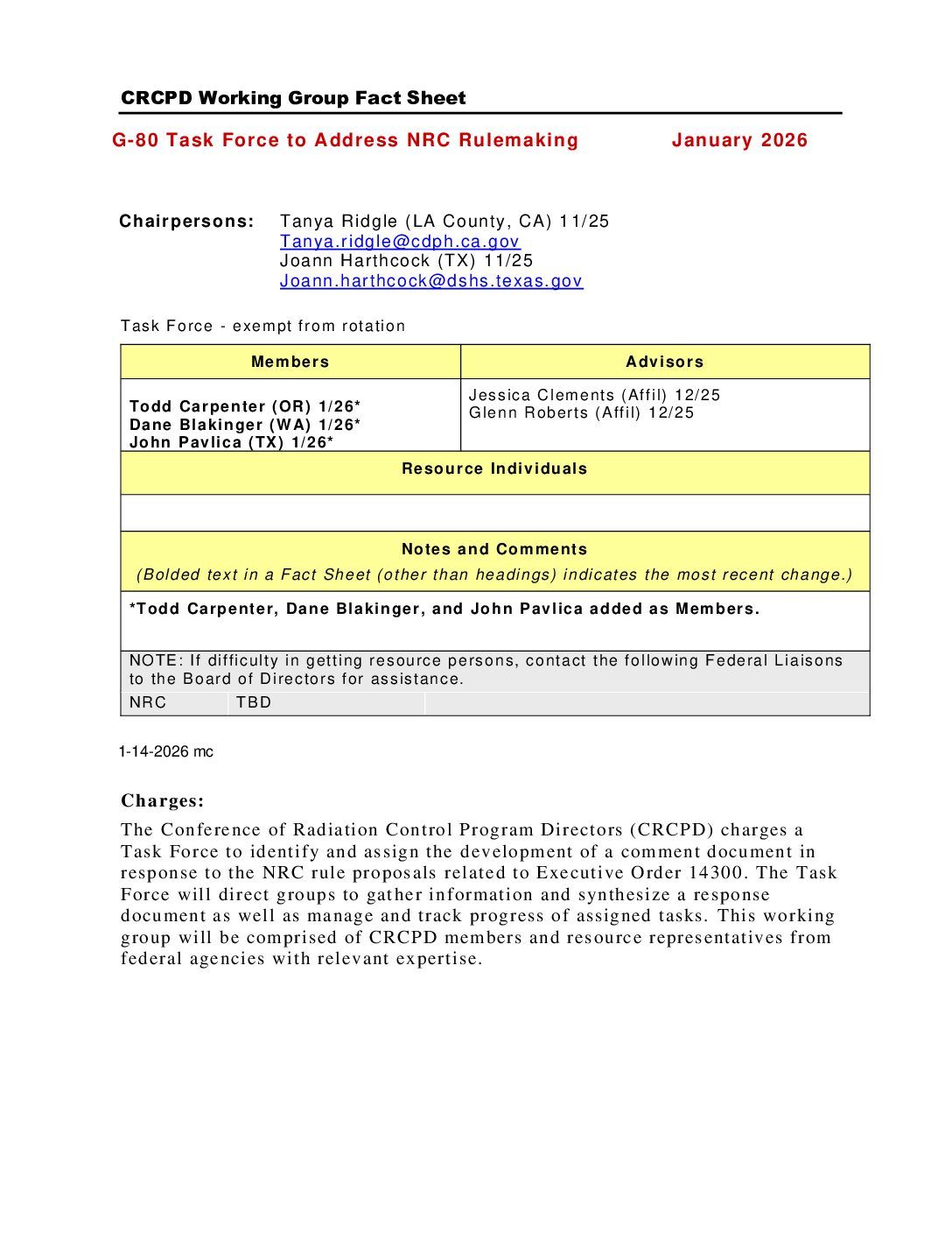 | Suggested State Regulations, Working Groups | SR-CC NRC RATS Compatibility Tracking Working Group | | | suggested-state-regulations working-groups |
